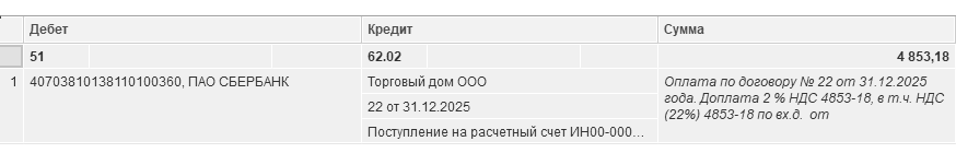 Цель – оказать услугу, выписать и выдать покупателю счет-фактуру на бумажном носителе. Зачесть предоплату, полученную в 2025 году. Получить проводку по зачету предоплаты: Д 62.02 К 62.01 – 291 191 руб. Получить от покупателя 2% НДС по доп. соглашению – 4 853,18 руб.