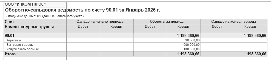 Разберемся с доходами. Сформируйте оборотно-сальдовую ведомость по счету 90.01, но в панели настроек снимите флаг "БУ (данные бухгалтерского учета)" и установите флаг "НУ (данные налогового учета)". Детализации по ставкам НДС нет. Отбор по номенклатурным группам оставьте. Отчет показан на рисунке 16.15.