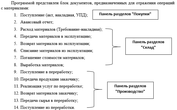 Некоторые документы нам знакомы, а все другие документы можно найти при помощи меню "Панель разделов/Склад/Панель навигации" и меню "Панель разделов/Производство/Панель навигации".