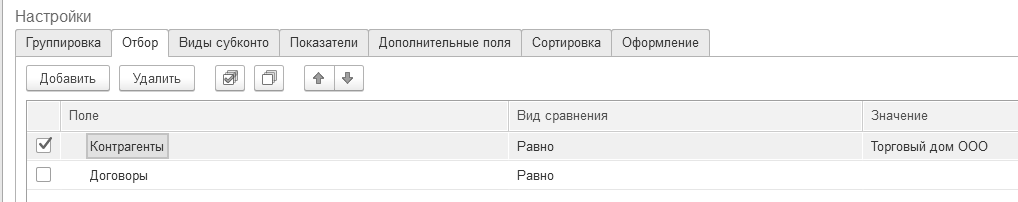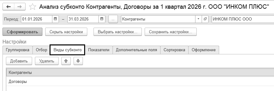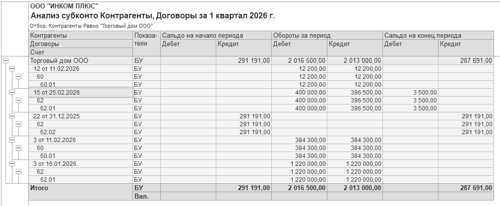 Сформируйте отчет "Анализ субконто" за 1 квартал 2026 года, по видам субконто "Контрагенты" и "Договоры", с отбором по ООО "Торговый дом", по субсчетам.