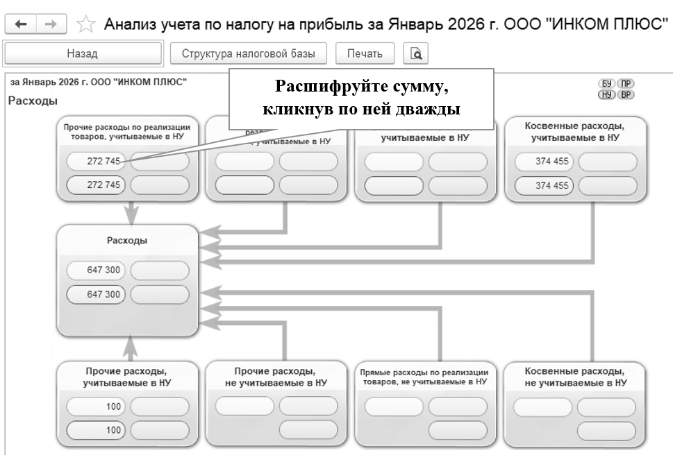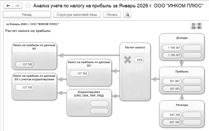 Сформируйте отчет "Анализ учета по налогу на прибыль" за январь 2026 года.