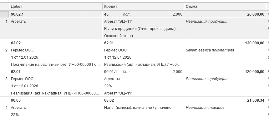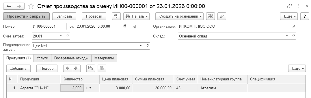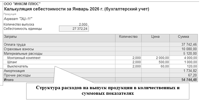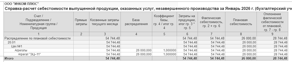 27.01.2026 года реализовано два агрегата "ЭЦ-11" по плановой стоимости 13 000 руб. Итого реализовано по плановой цене на 26 000 руб. Фактическая стоимость единицы продукции 27 372,24 руб. (54 744,48 ÷ 2 ед.)
