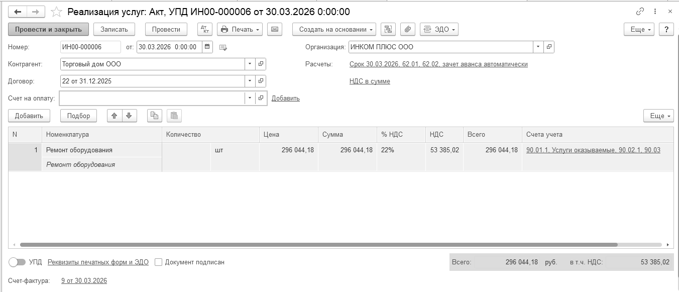 30.03.2026 года отремонтировано оборудование для ООО "Торговый дом" на сумму 296 044,18 руб., в т. ч. НДС 22% - 53 385,02 руб.