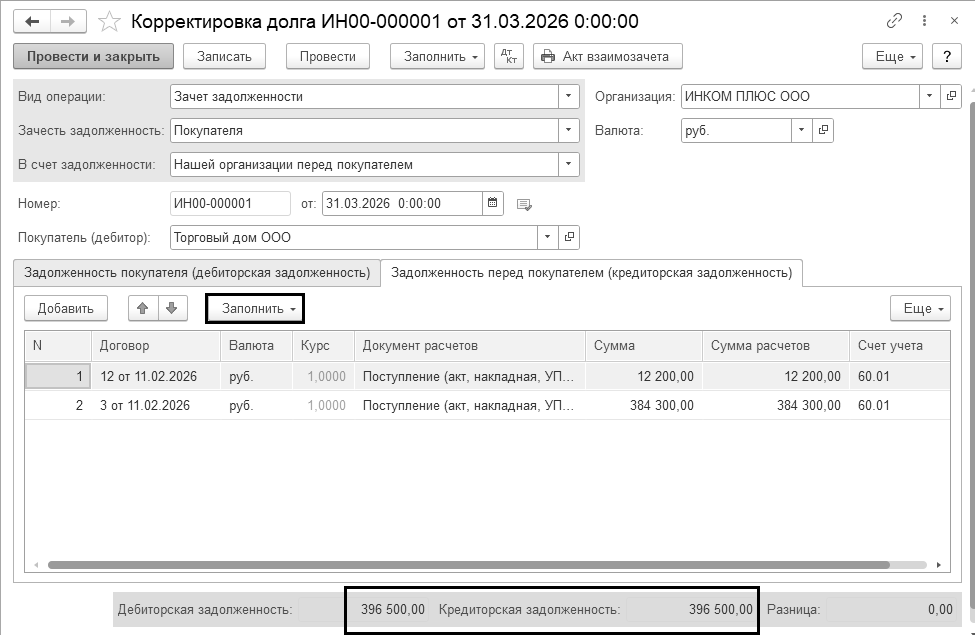 31.03.2026 года создайте документ "Корректировка долга". Вид операции "Зачет задолженности". Взаимозачет можно проводить на сумму 396 500 руб. (рис. 13.2).