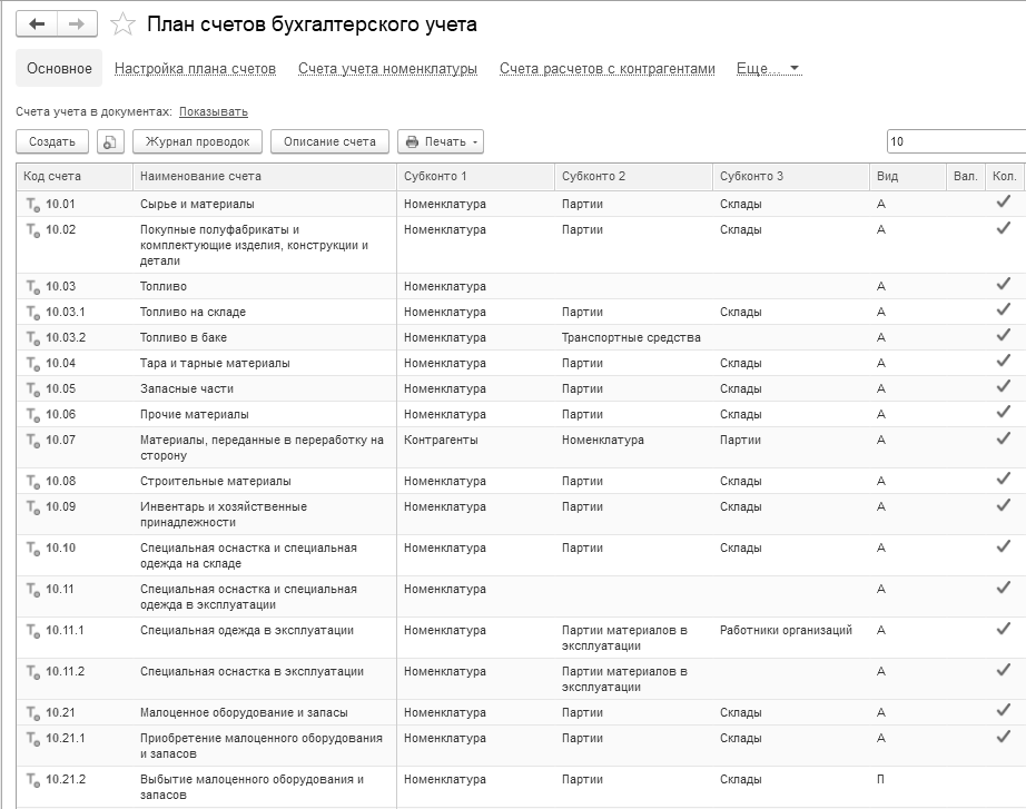 Учет материалов ведется на счете 10 "Материалы". На рисунке 14.1 представлен фрагмент окна плана счетов бухгалтерского учета программы "1С:Бухгалтерия 8" редакции 3.0.