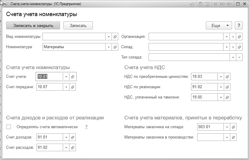 В шапке документа "Поступление (акт, накладная, УПД)" следует указать контрагента и договор с ним. При оформлении договора устанавливается вид договора "С поставщиком". В документах по поступлению ТМЦ особенности учета НДС задаются в форме "Цены в документе". Счет учета НДС, устанавливаемый по умолчанию в документах по поступлению ТМЦ, задается в регистре сведений "Счета учета номенклатуры". Для группы "Материалы" назначены счета учета, которые представлены на рисунке 14.4.