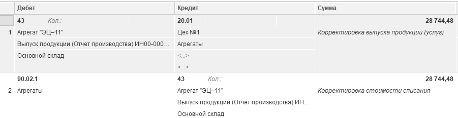 Бухгалтерская запись Д 43 К 20.01 на сумму 28 744,48 руб. получилась как разница между плановой стоимостью готовой продукции (2 агрегата "ЭЦ–11" на сумму 26 000 руб.) и фактической себестоимостью продукции (списанные материалы 5 120 руб., заработная плата 37 742,46 руб., страховые взносы 10 147,20 руб. сотрудника Остапенко Е. Д., амортизация 1 734,82 руб.):