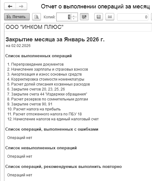 В январе 2026 года воспользуйтесь помощником "Закрытие месяца" и последовательно закройте все необходимые программе операции.