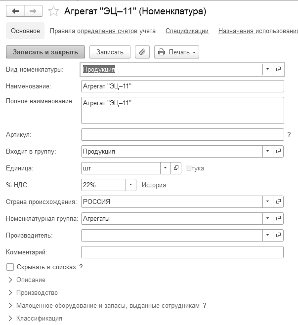 Элемент "Ремонт оборудования" занесите в папку "Услуги". Укажите номенклатурную группу "Услуги оказываемые".