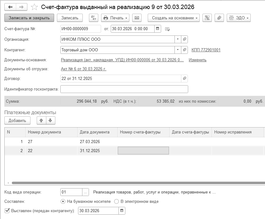 30.03.2026 года оформить документ "Реализация (акт, накладная, УПД)".
