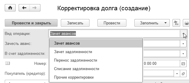 Рис. 13.1. Список видов операций документа "Корректировка долга"