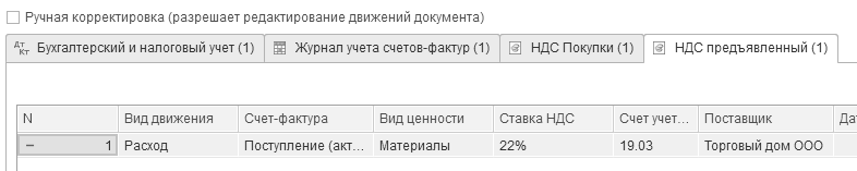 Рис. 13.5. Форма окна документа "Корректировочный счет-фактура на аванс", проводки