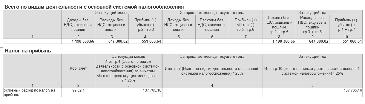 Данный отчет показывает финансовый результат по данным бухгалтерского учета и расчет налоговой базы по налогу на прибыль, показывает расчет корректировок налога на прибыль в соответствие с требованиями ПБУ 18/02 "Учет расчетов по налогу на прибыль" для организаций, не применяющих упрощенную систему налогообложения.