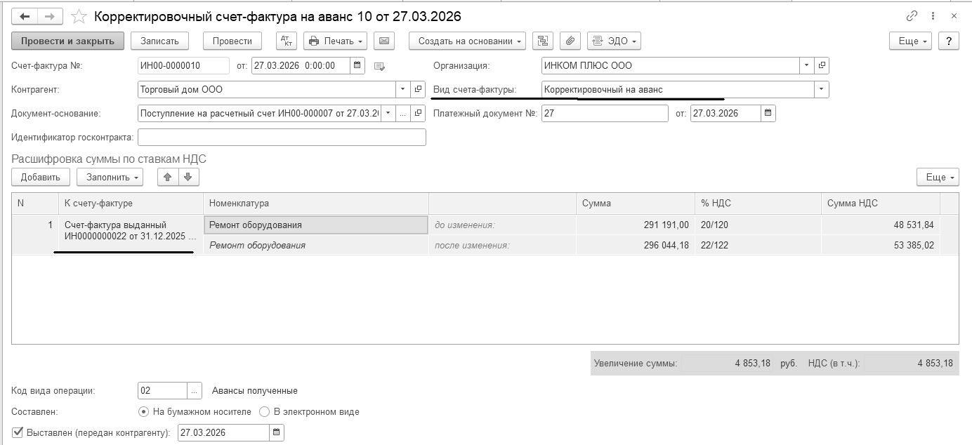 Выставить покупателю корректировочный счет-фактуру на разницу в сумме 4 853,18 руб. (рис. 13.5).