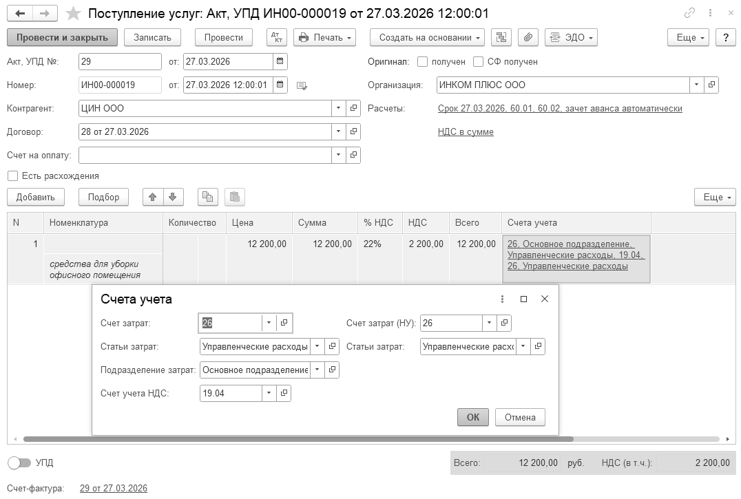 27.02.2026 года создайте документ "Реализация (акт, накладная, УПД)". Окажите услугу "Ремонт оборудования" контрагенту ООО "Торговый дом" по договору № 15 от 25.02.2026 года на сумму 400 000 руб., НДС 22% в том числе. Покупателю услуги выданы акт и счет-фактура.