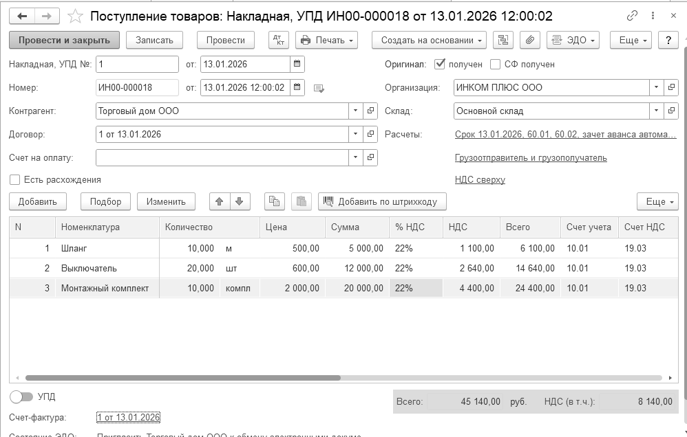 13.02.2026 года ООО "Торговый дом" по договору № 3 от 11.02.2026 года продал оборудование для обработки пластмасс ООО "ИНКОМ ПЛЮС". Оплату за оборудование в сумме 384 300 руб. организация "ИНКОМ ПЛЮС" не произвела. Документ "Поступление (акт, накладная, УПД)" в базу занесен.