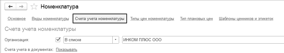 Рис. 14.4. Регистр сведений "Счета учета номенклатуры"