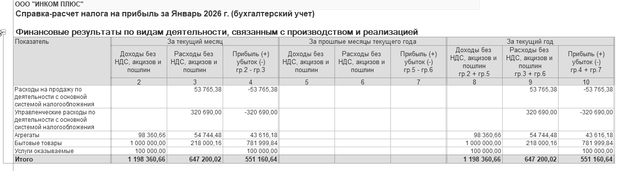 Справка-расчет "Расчет налога на прибыль" отражает сопоставление доходов и расходов организации на момент проведения регламентных операций закрытия месяца: