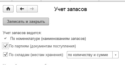 На ссылке "Учет запасов" установлен флаг "По партиям (документам поступления)". Учет по складам (местам хранения) ведется по количеству и сумме (рис. 14.2).