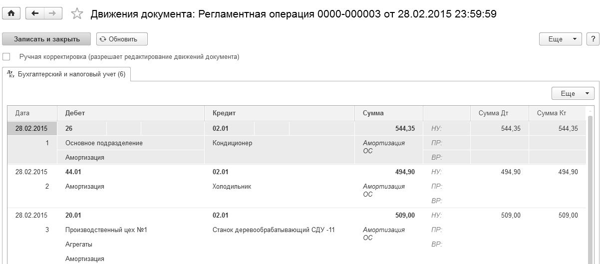 Документ "Регламентная операция" по виду операции "Амортизация и износ основных средств" за февраль 2015 года, в процессе работы для целей примера, будет много раз вновь проводиться. Поэтому, новые документы "Регламентная операция" с указанной операцией за февраль создавать не надо. Надо только найти первый документ "Регламентная операция" за февраль и вновь его провести, нажав кнопку "Выполнить и закрыть". Амортизация для основного средства может быть начислена только один раз за месяц.