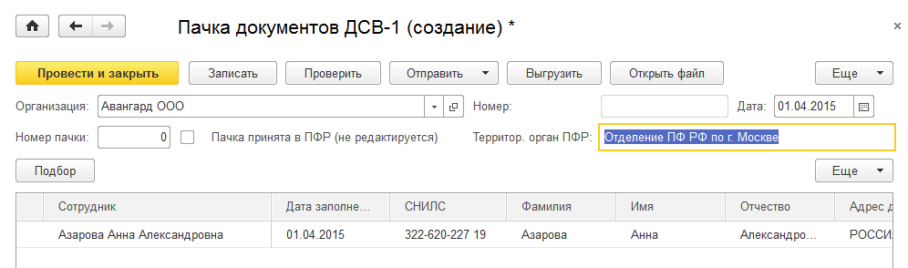 Проведение документа означает, что данные переданы в отделение ПФР. Пачку можно передать в архив, установив соответствующий флажок.