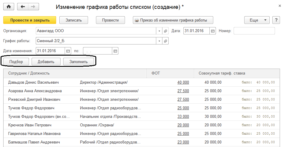 Список сотрудников можно заполнить автоматически по команде "Заполнить" либо составить вручную (команды "Подбор" и "Добавить").
