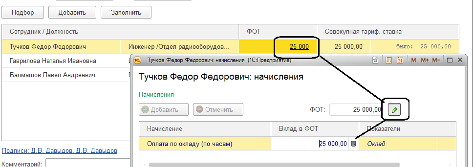 При этом анализируется ФОТ каждого сотрудника, при необходимости производится пересчет ФОТ (либо ручное редактирование).