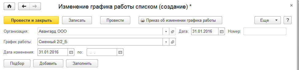 Создадим документ "Изменение графика работы списком" для ООО "Авангард". Для этого в разделе "Зарплата/ Изменение оплаты труда" по команде "Создать/ Изменение графика работы списком" добавим новый документ на 31.01.2016.
