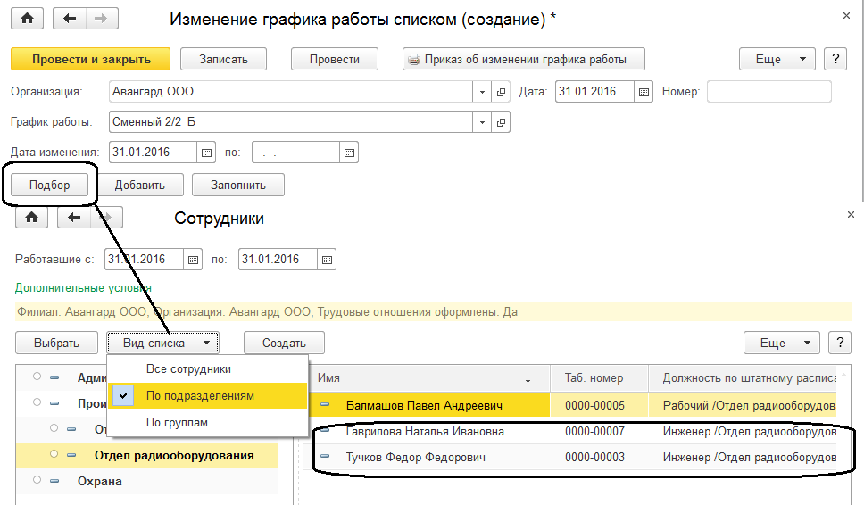 Инженерам отдела радиооборудования с 31.01.2016 устанавливается график "Сменный 2/2 Б". Воспользуемся командой "Подбор" и выберем инженеров, кликнув на сотрудника два раза левой клавишей мыши.