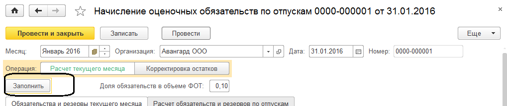 - Сформируем оценочные обязательства за январь 2016 года для ООО "Авангард". Для этого откроем список документов в разделе "Зарплата/ Начисление оценочных обязательств по отпускам" и добавим новый документ. Укажем месяц формирования – январь 2016, организацию и заполним документ автоматически по команде "Заполнить".