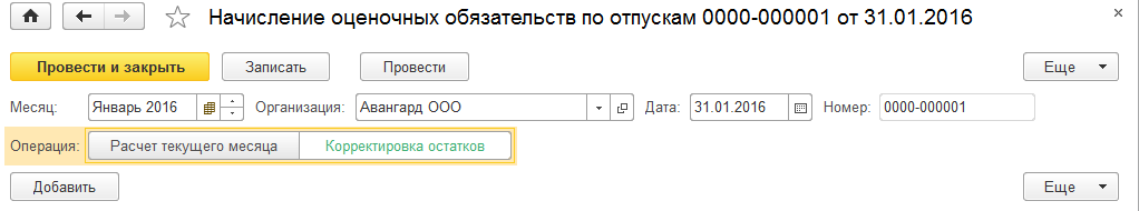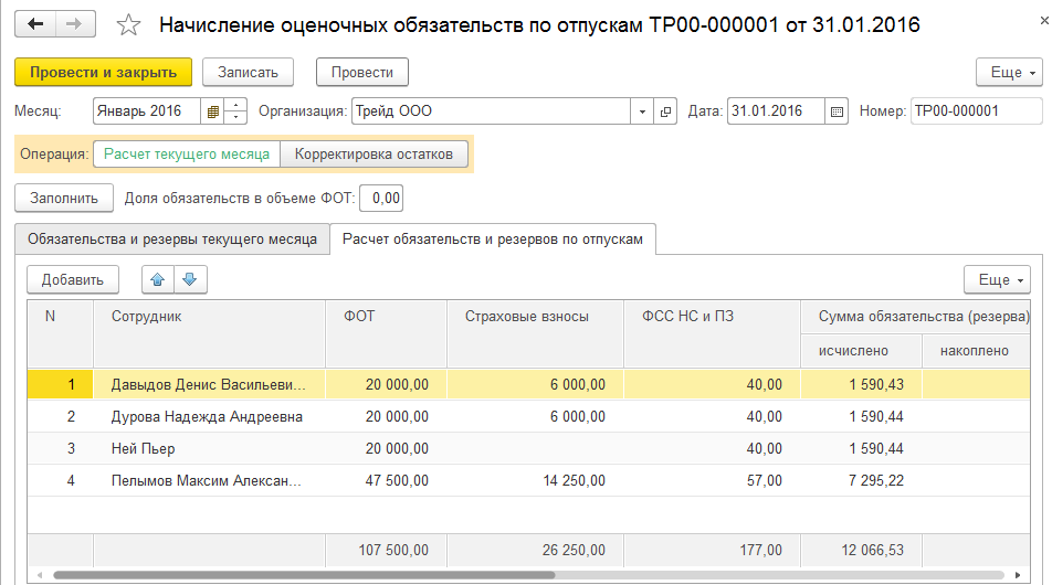 - Сформируем документ "Начисление оценочных обязательств по отпускам" за январь 2016г. для ООО "Трейд" аналогичным образом:
