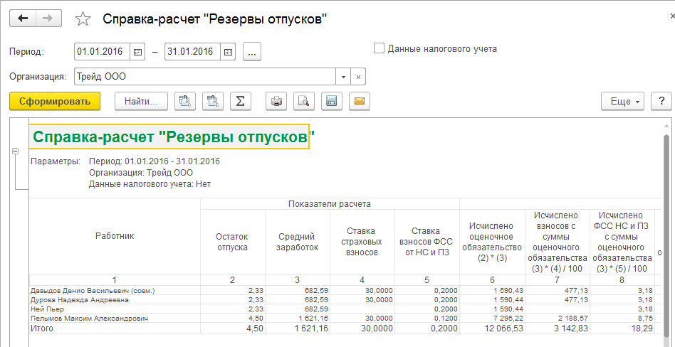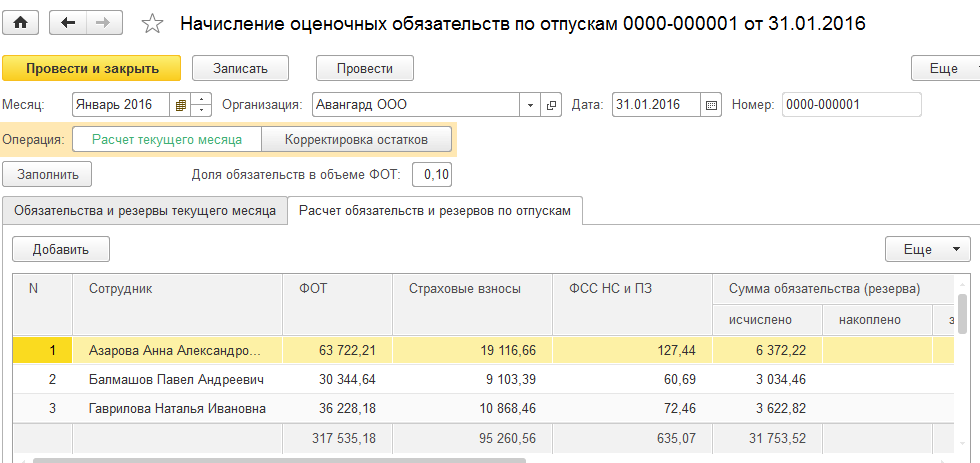 На закладке "Расчет обязательств и резервов по отпускам" представлен расчет этих же обязательств, в разрезе сотрудников. Эта информация может использоваться для контроля и анализа расчета.
