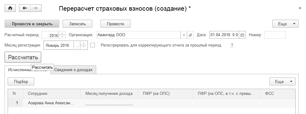 Также в программе реализован документ "Перерасчеты страховых взносов". Он вызывается из раздела "Налоги и взносы". Он используется, если требуется пересчитать взносы при изменениях "задним числом" и отразить корректировки к отчетности.