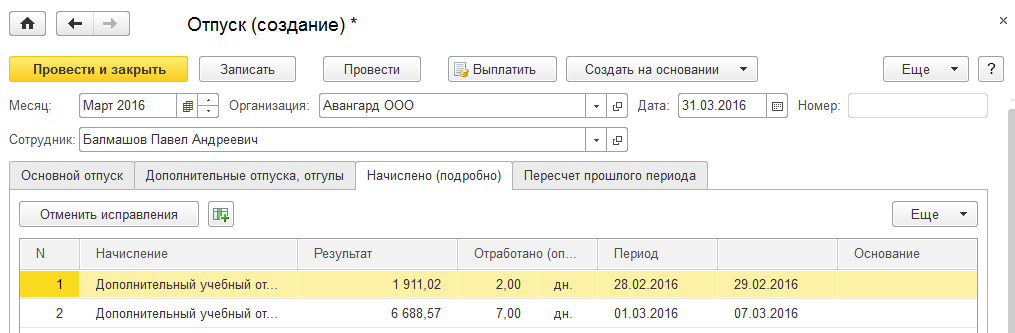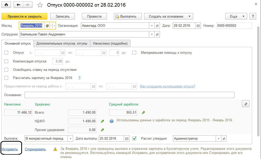 Сотруднику ООО "Авангард" Балмашову П.А. в феврале начислена сумма отпускных (учебный отпуск). В марте оказалось, что отпуск заканчивается раньше - 07.03.2016, необходимо отозвать из отпуска и пересчитать отпускные. Создадим документ-исправление. Для этого откроем февральский документ "Отпуск" (в нем уже ничего не меняем!), и нажимаем команду "Исправить".