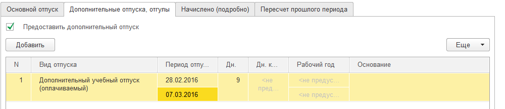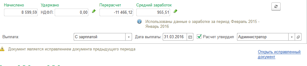 При этом будет создан новый документ-исправление с месяцем начисления Март. Новые сроки отпуска по 07.03.16 - укажем во вновь созданном документе, перерасчет будет произведен автоматически.