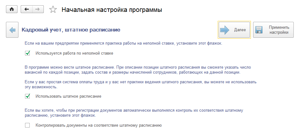 При включенной настройке использования штатного расписания будут предложены следующие шаги: для настройки особенностей позиции штатного расписания.  Данные настройки соответствуют настройкам программы в разделе "Кадровый учет / Настройка штатного расписания".