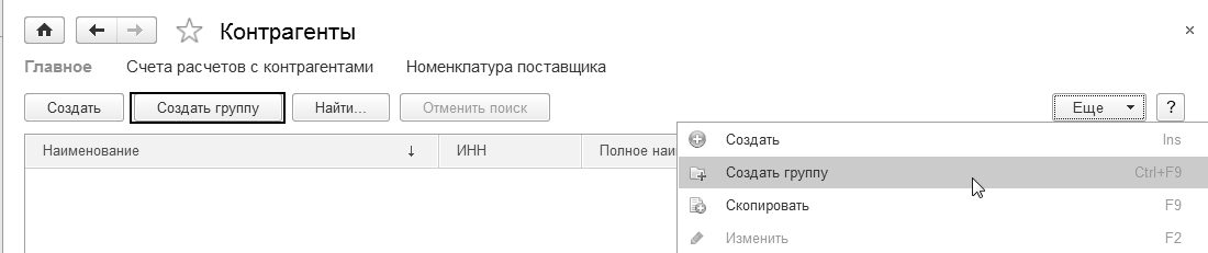 Чтобы сделать справочник двухуровневым, т.е. организовать иерархическую структуру, воспользуйтесь меню "Еще/Создать группу" или воспользоваться одноименной кнопкой (рис.1 .13.2).
