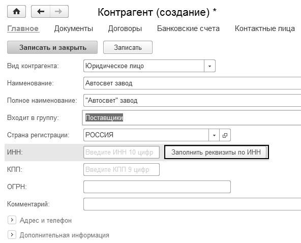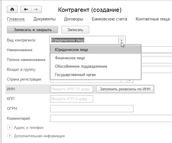 Форма элемента контрагента состоит из ссылок верхней части: "Главное", "Документы", "Договоры", "Банковские счета", "Контактные лица". По ссылкам в нижней части формы можно заполнить адреса, телефоны и дополнительную информацию о контрагенте.