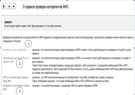 При создании нового контрагента программа обращается к сервису ФНС и проверяет корректность реквизитов контрагента. Результат проверки отражается в карточке контрагента, где: 1 – зеленый цвет, 2 – серый цвет. 3 – красный цвет (рис. 1.13.5).
