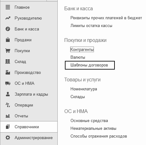 По ссылке "Договор", при помощи кнопки "Создать" можно заполнить данные нового договора. Программа позволяет формировать тексты договоров с использованием имеющихся реквизитов организации. Для этой цели в разделе "Справочники" на панели навигации "Покупки и продажи" присутствует список шаблонов трех видов договоров (рис. 1.13.7):