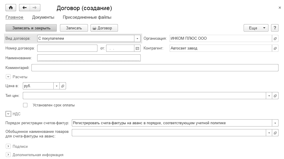 Важно обратить внимание на порядок заполнения реквизита "Договор". Для каждого договора задается вид договора: