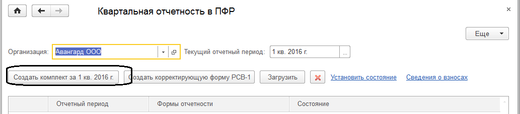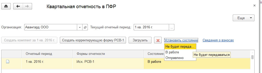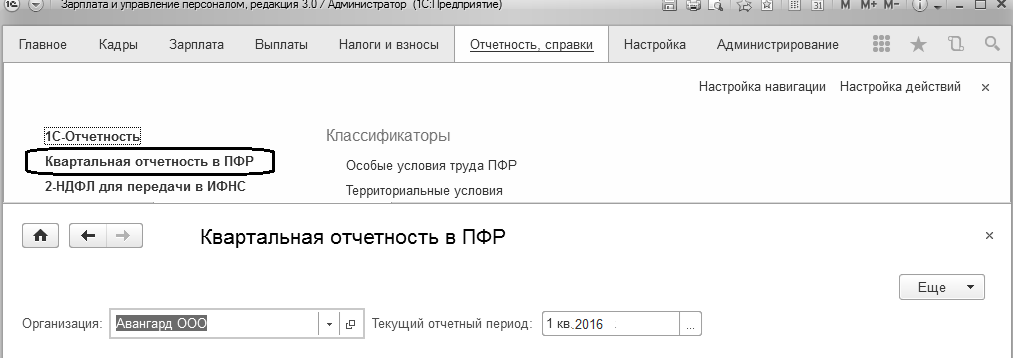Сформируем квартальный отчет по персонифицированному учету с использованием обработки "Квартальная отчетность в ПФР" за 1 кв.2016г. для ООО "Авангард" и для ООО "Трейд".