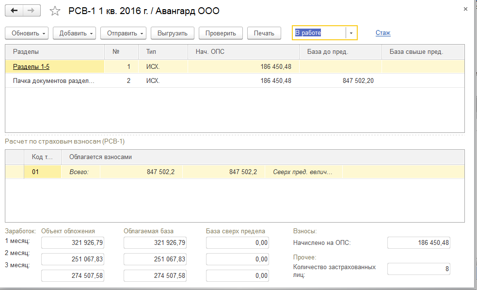 Получим готовый отчет РСВ-1 и прилагаемые к нему пачки персонифицированного учета по сотрудникам.