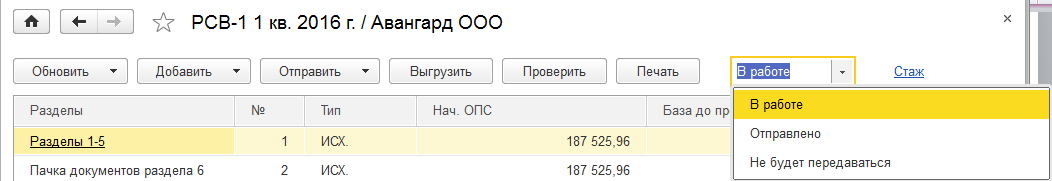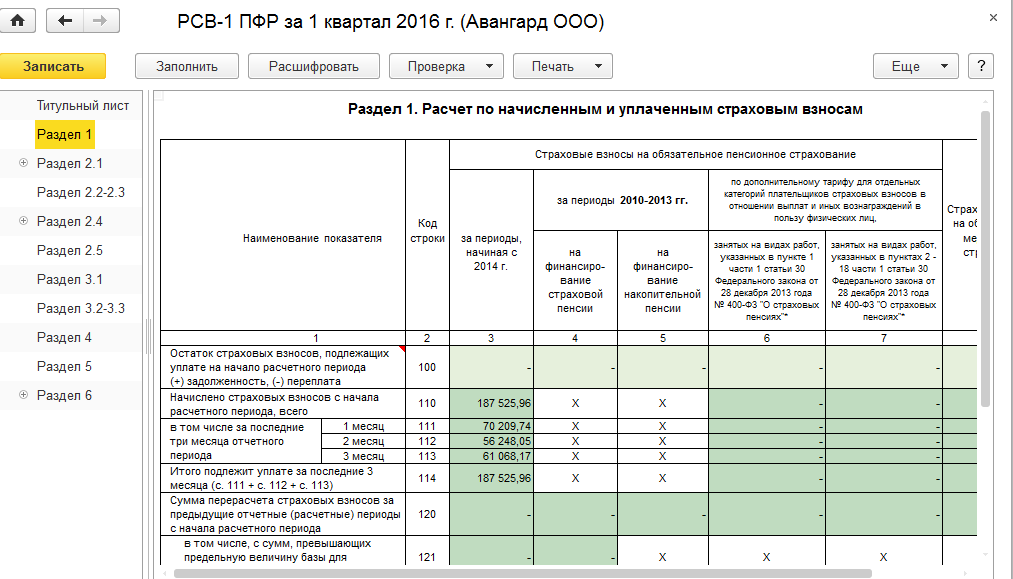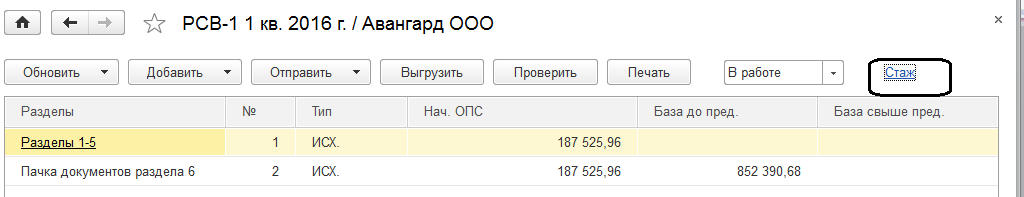 При нажатии ссылки "Разделы 1-5" открывается форма РСВ-1 (ее сводная часть).