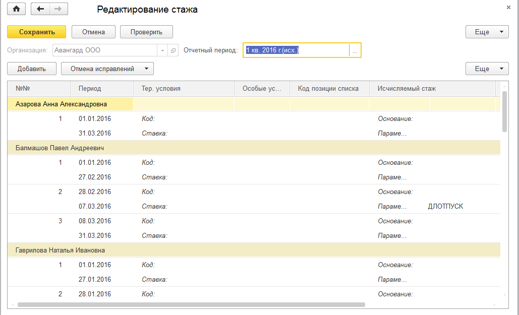 При переходе к пачкам разделов в форме отображаются сотрудники, входящие в пачку данного раздела. При необходимости можно отредактировать вручную как данные сотрудника по базе и взносам, так и периоды стажа.