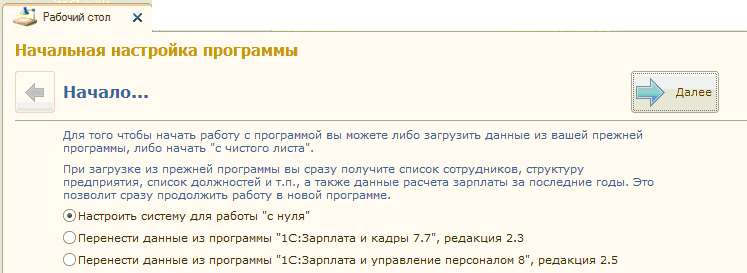 После запуска программы, пользователю предлагается пройти анкетирование и выполнить (либо проверить после переноса) начальные настройки. В данном случае пользователь выбирает "Настроить систему для работы "с нуля".