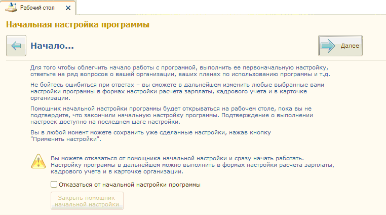 В рамках курса для изучения работы помощника начальной настройки продолжим выполнять действия, нажав команду "Далее", отказ от начальной настройки не требуется.