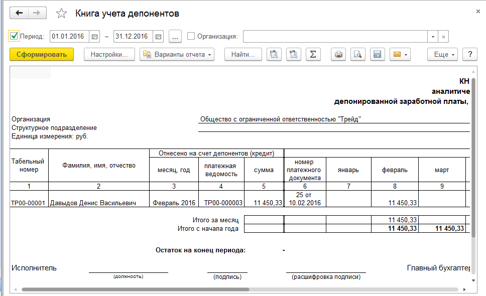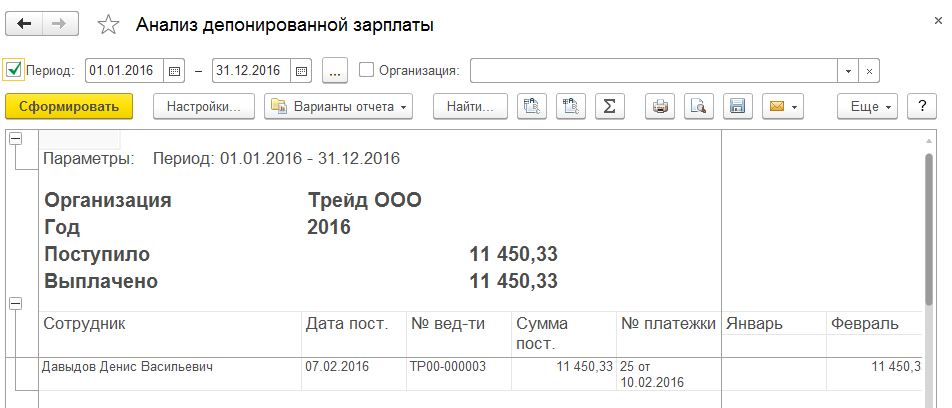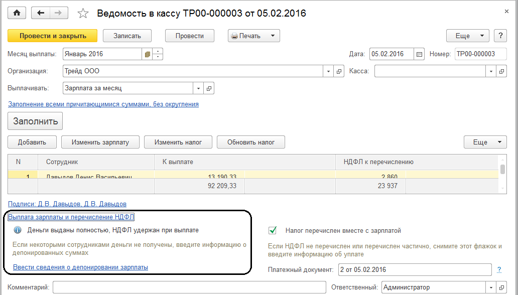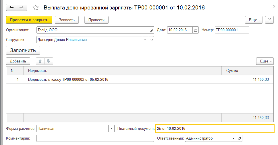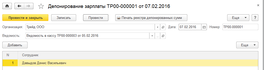 Создадим для ООО "Трейд" документ "Депонирование" на основании ведомости на выплату зарплаты через кассу для Давыдова Д.В.: в течение трех дней сотрудник не получил зарплату за месяц, дата документа-депонирования 07.02.2016, сотрудник выбирается в документе вручную.