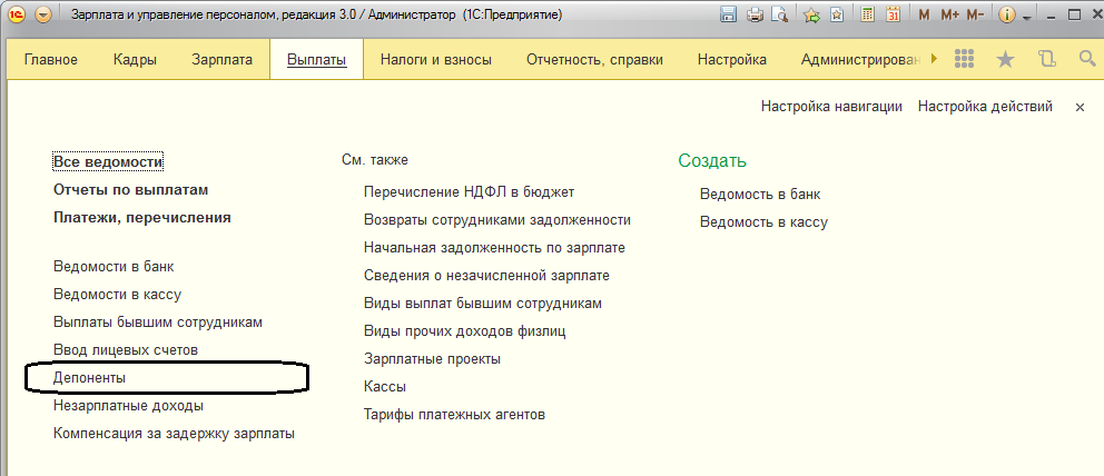 Если сотрудник впоследствии пришел получать депонированную зарплату, то создается документ "Выплата депонированной зарплаты". Документ доступен из раздела "Выплаты / Депоненты".