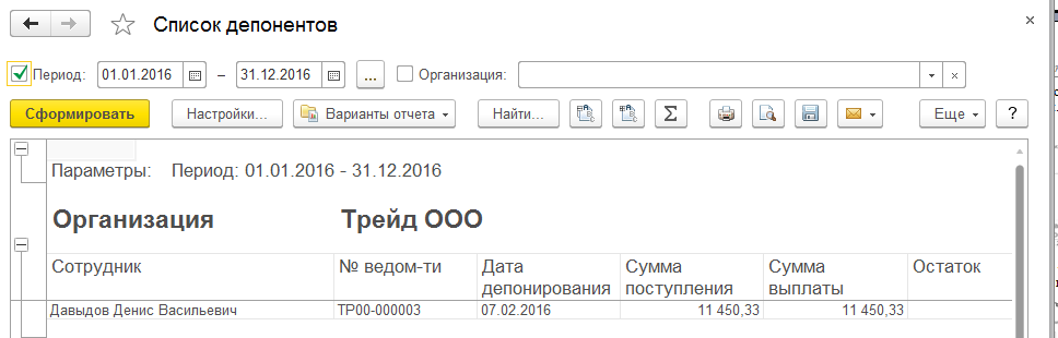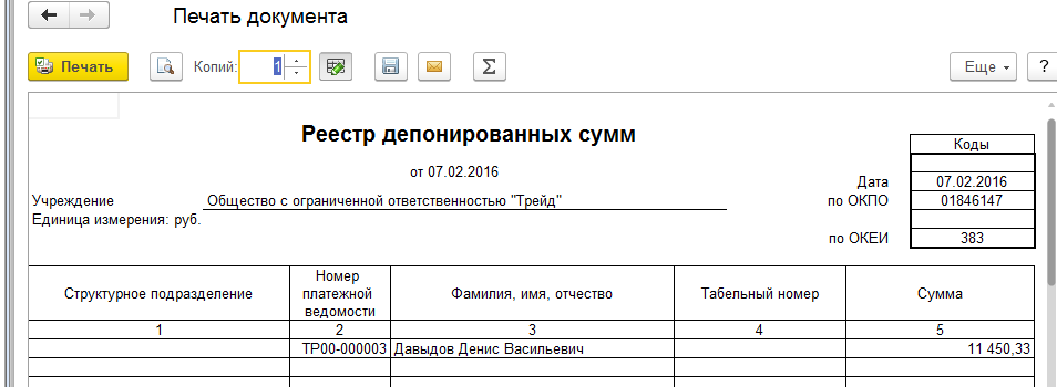 Проведем документ. Выведем на печать реестр депонированных сумм.
